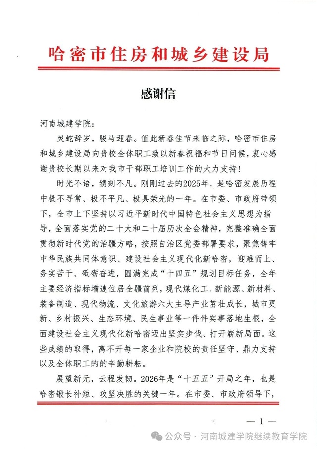近期,哈密市住房和城乡建设局向我校发来感谢信,对河南城建学院继续教育学院长期以来在哈密市干部职工培训工作中的大力支持与倾情助力致以诚挚谢意,并向全校教职工送上新春的美好祝福。