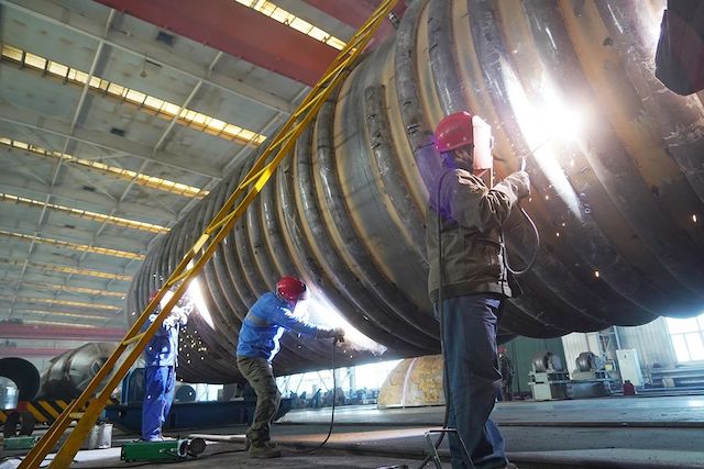 在新疆兰石重装能源工程有限公司生产车间,工作人员正在赶制一批来自伊吾工业园区的能源企业设备订单。(资料图片)