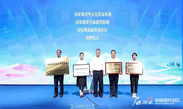 会上,自治区党委书记马兴瑞为国家对外文化贸易基地、国家级滑雪旅游度假地、国家级旅游休闲街区授牌。石榴云/新疆日报记者崔志坚摄