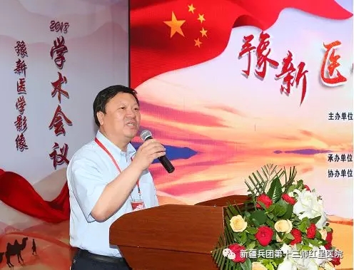 红星医院党委副书记、院长王邦龙代表承办单位致词。他首先对各位领导嘉宾的到来表示热烈欢迎,对长期以来给予红星医院关心帮助的河南省卫计委、河南省援疆工作前方指挥部、新疆医学会、兵团医学会、哈密市卫计委、十三师卫生局表示衷心感谢!他说,自中央第二次新疆工作座谈会后,河南省委、省政府高度重视援疆工作,河南省援疆工作前方指挥部提出“4+1” 组团式帮扶,全力推进红星医院“4321”工程建设,四个医学中心、三个专科联盟、两个教学医院相继挂牌成立,为我院学科发展开启了全新里程。此次学术会议给我们带来国内外最前沿的学术科研成果,必将有效的促进哈密区域影像诊疗水平的不断提高,为哈密卫生事业的发展作出积极的贡献。