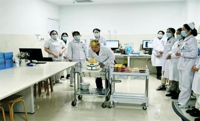 小推车上摆放着精致的蛋糕和水果,代表着科室全体医护人员对倪天宇的祝福与感谢,感谢他在援疆期间对科室工作的帮扶和支持,歌声、欢笑声伴随着蛋糕的甜蜜,办公室里一片温馨……