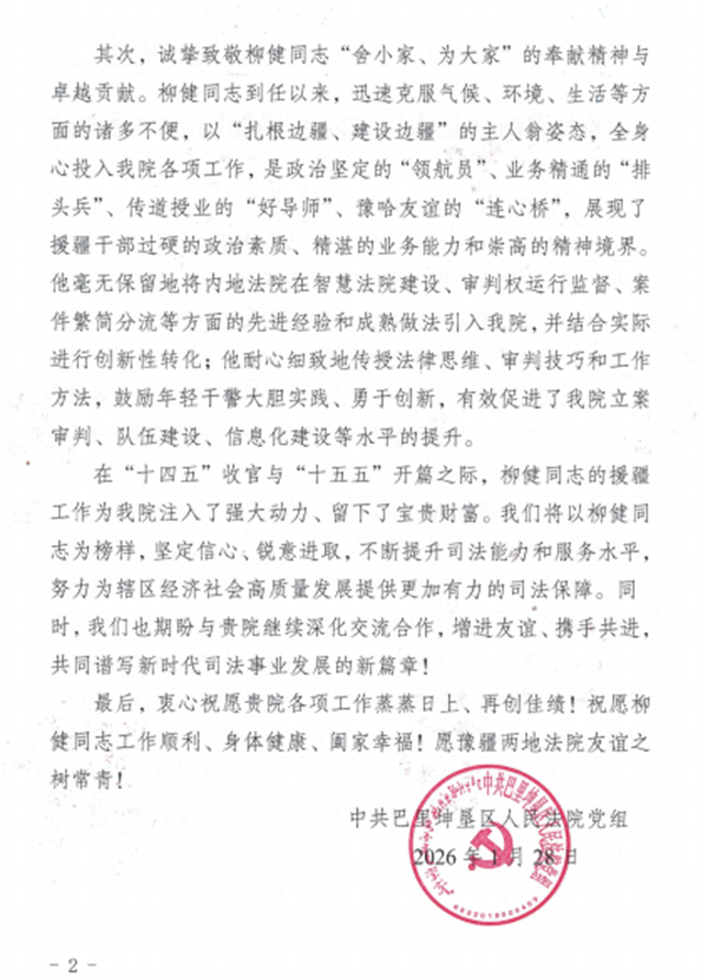 近日,商城县人民法院收到来自新疆生产建设兵团巴里坤垦区人民法院的感谢信,信中对商城法院积极响应援疆号召、无私输送优秀干部表示衷心感谢,对援疆干部柳健同志的卓越工作和奉献精神给予高度赞誉。